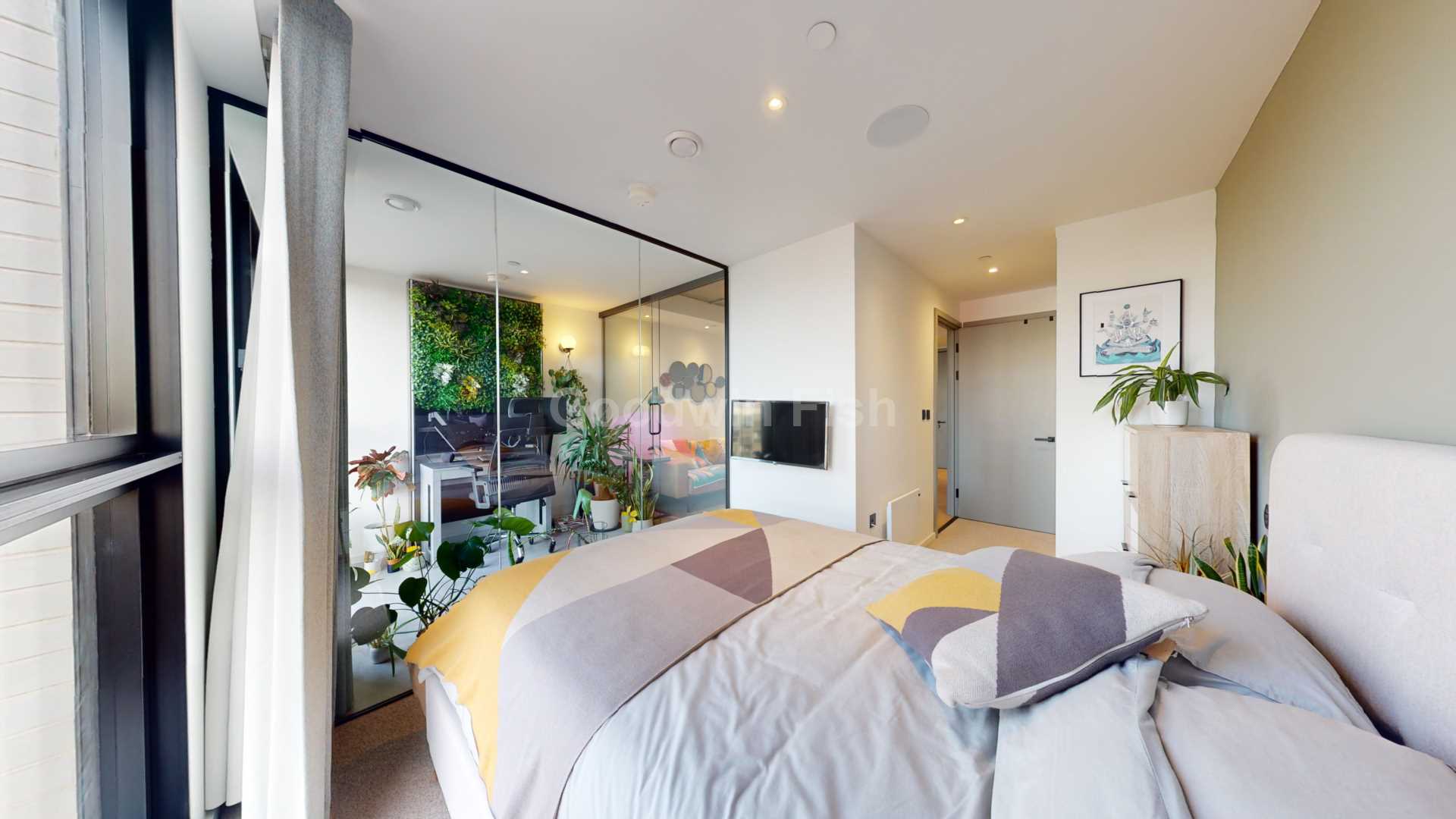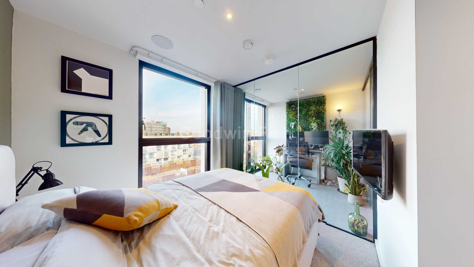 Bedroom - Floor to ceiling windows dressed with fleece lined black out wave curtains. Bespoke fitted mirrored wardrobe by Sharps. Recessed ceiling speakers.