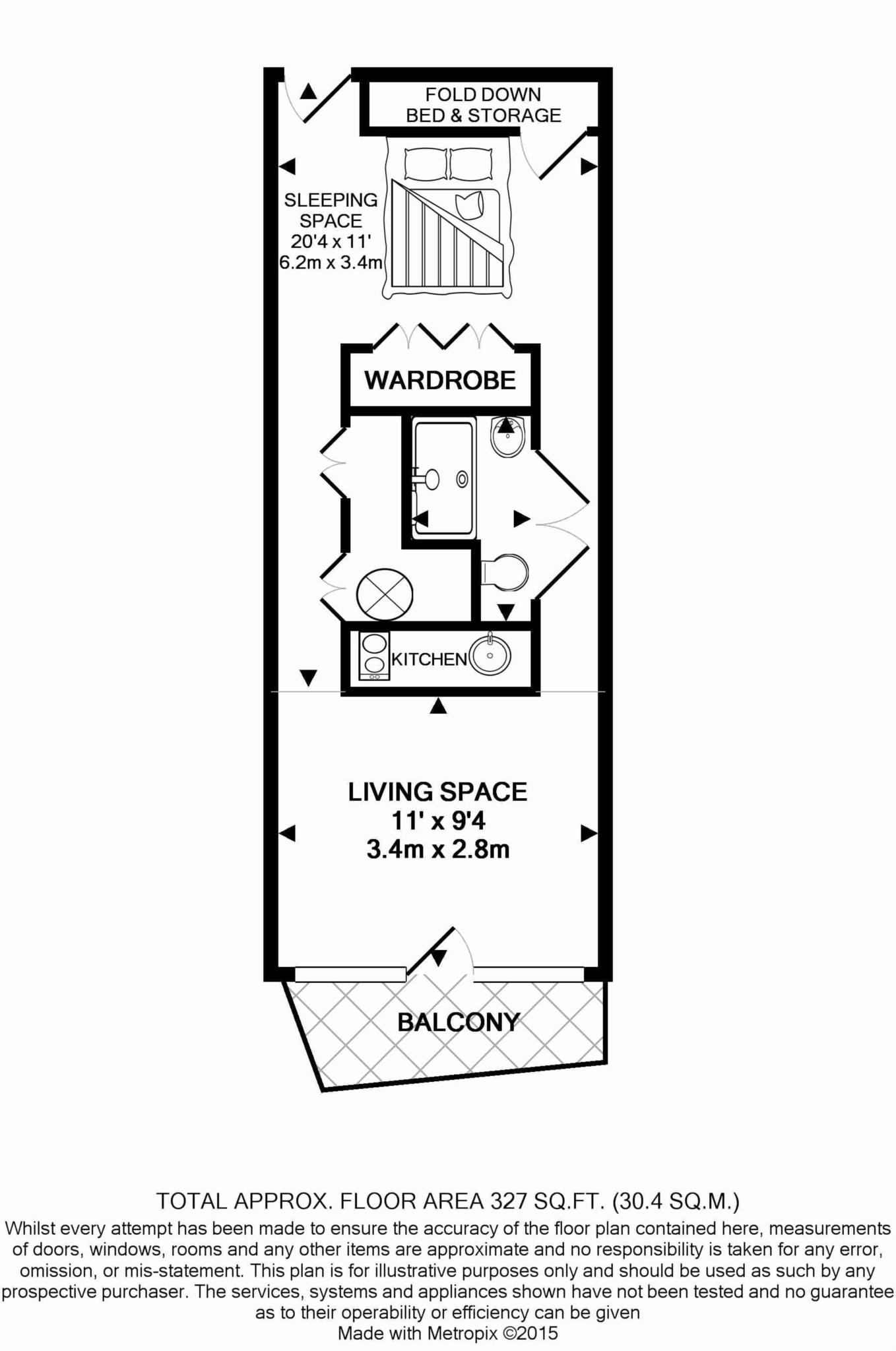 Property briefly comprises: Bedroom area with pull down bed and clothes storage, shower room with separating wall partitions, fitted kitchen with appliances and an open plan lounge area with access to a balcony with views over Salford.