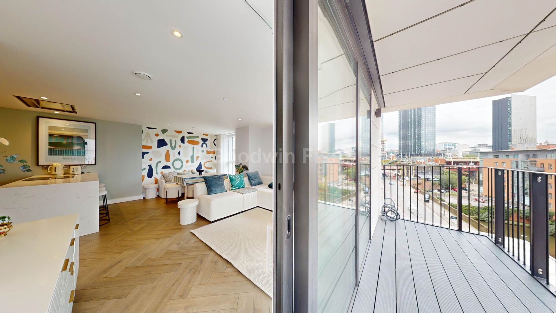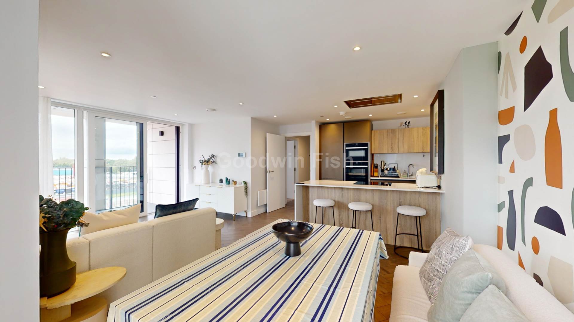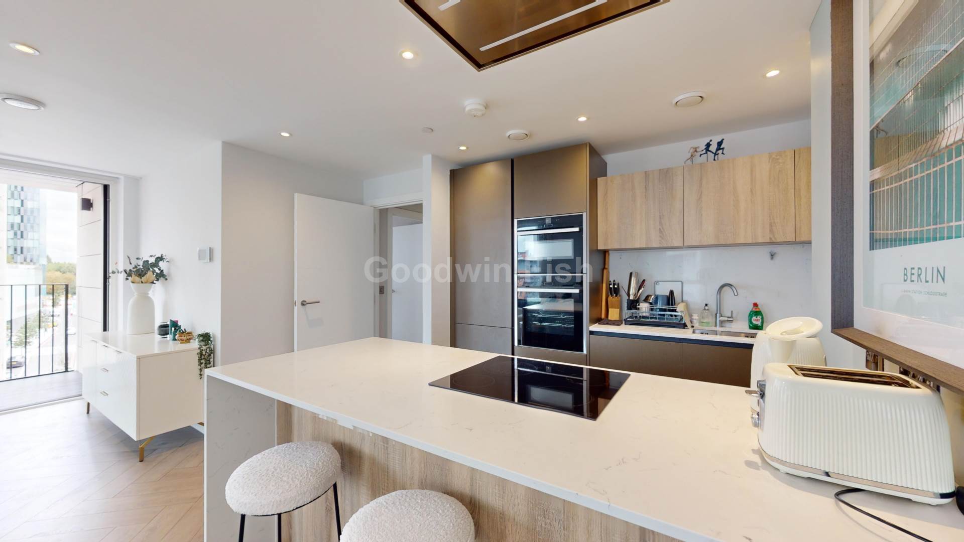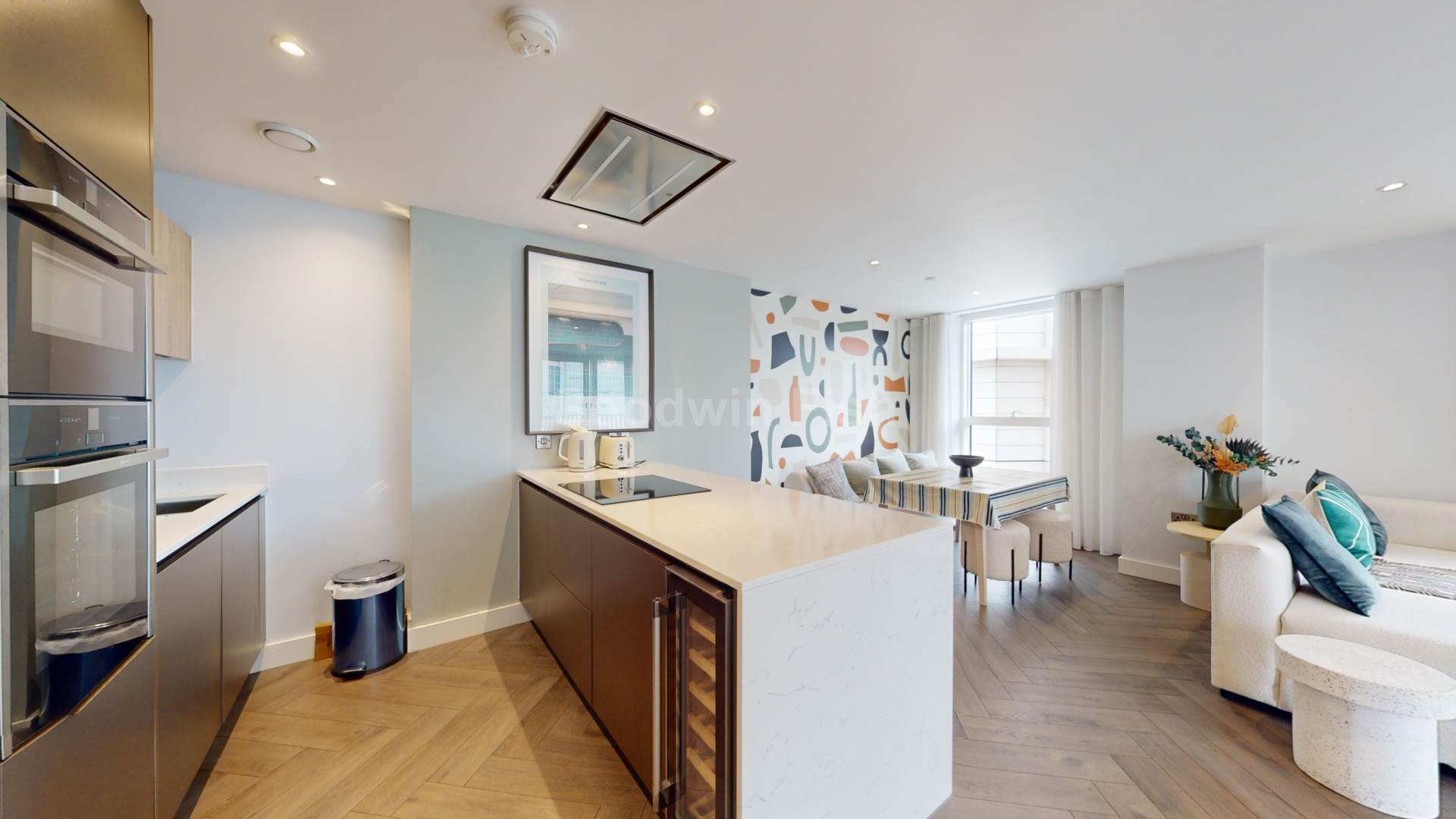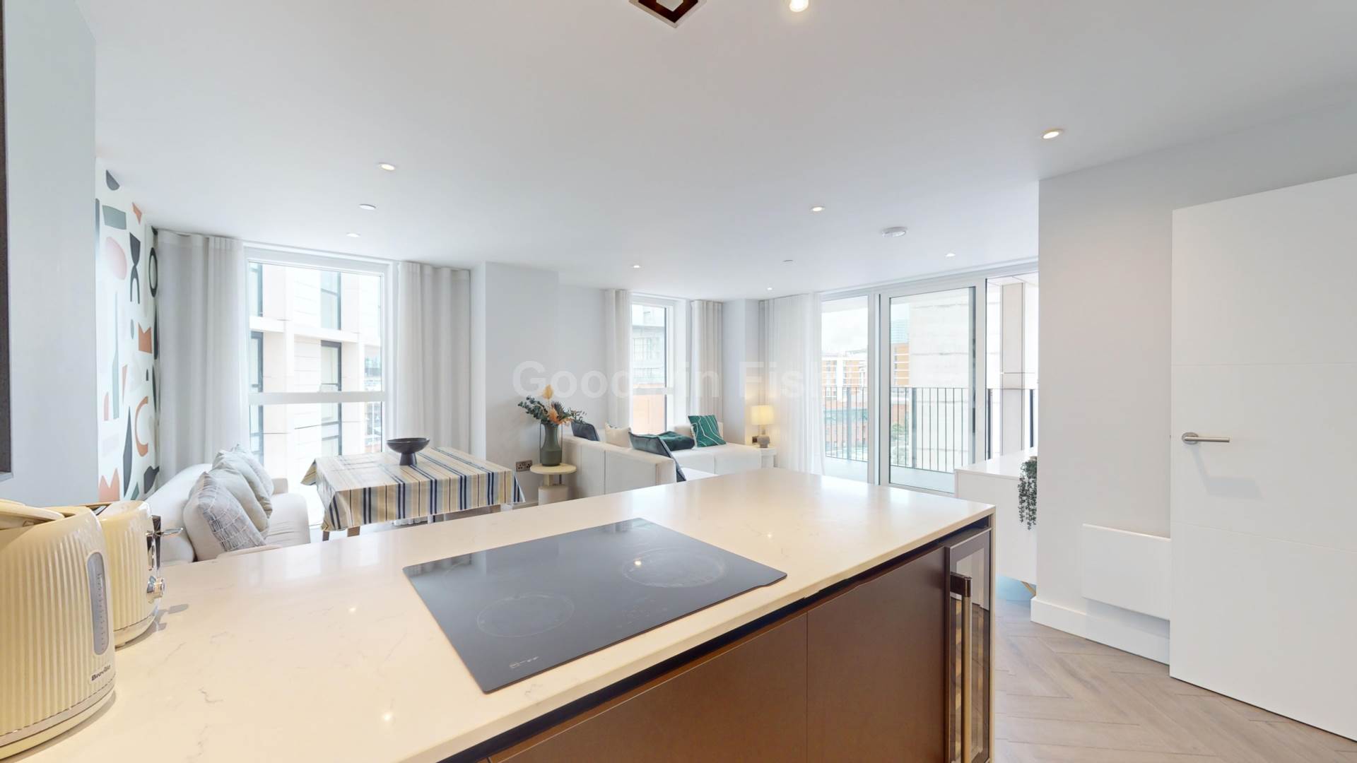 Internally, substance, style and comfort are attributes that run throughout. Textured Herringbone style flooring. Sliding doors onto a substantial southeast facing balcony. Bright and well ventilated. The ideal sanctuary. Island work top in white quartz - the kitchen`s centre piece. A breakfast bar for informal dining. NEFF integrated kitchen appliances. The signature wine cooler. No expense spared. Ample storage. Sumptuous double bedrooms. Fitted mirrored wardrobe and en suite to the primary. The option for a study/work-from-home space. Opulent bathrooms. Marble effect tiles and mirrored vanity units.