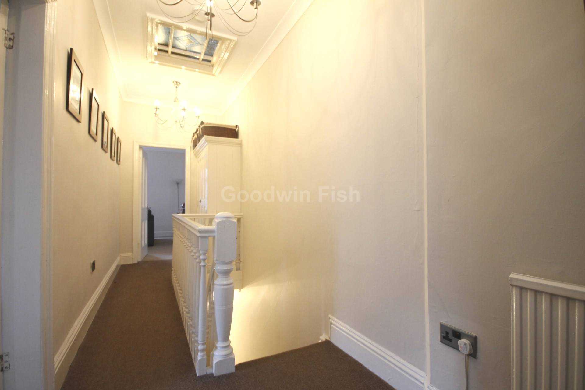 The living accommodation is accessed via the hallway, stairs, and attractive landing area featuring original restored skylights. Two grand chandeliers grace the traditionally high ceilings typical of the Edwardian era, illuminating a spacious landing area adorned with a solid natural wood chest of drawers & lamp and a gallery of framed photographs of local scenery.