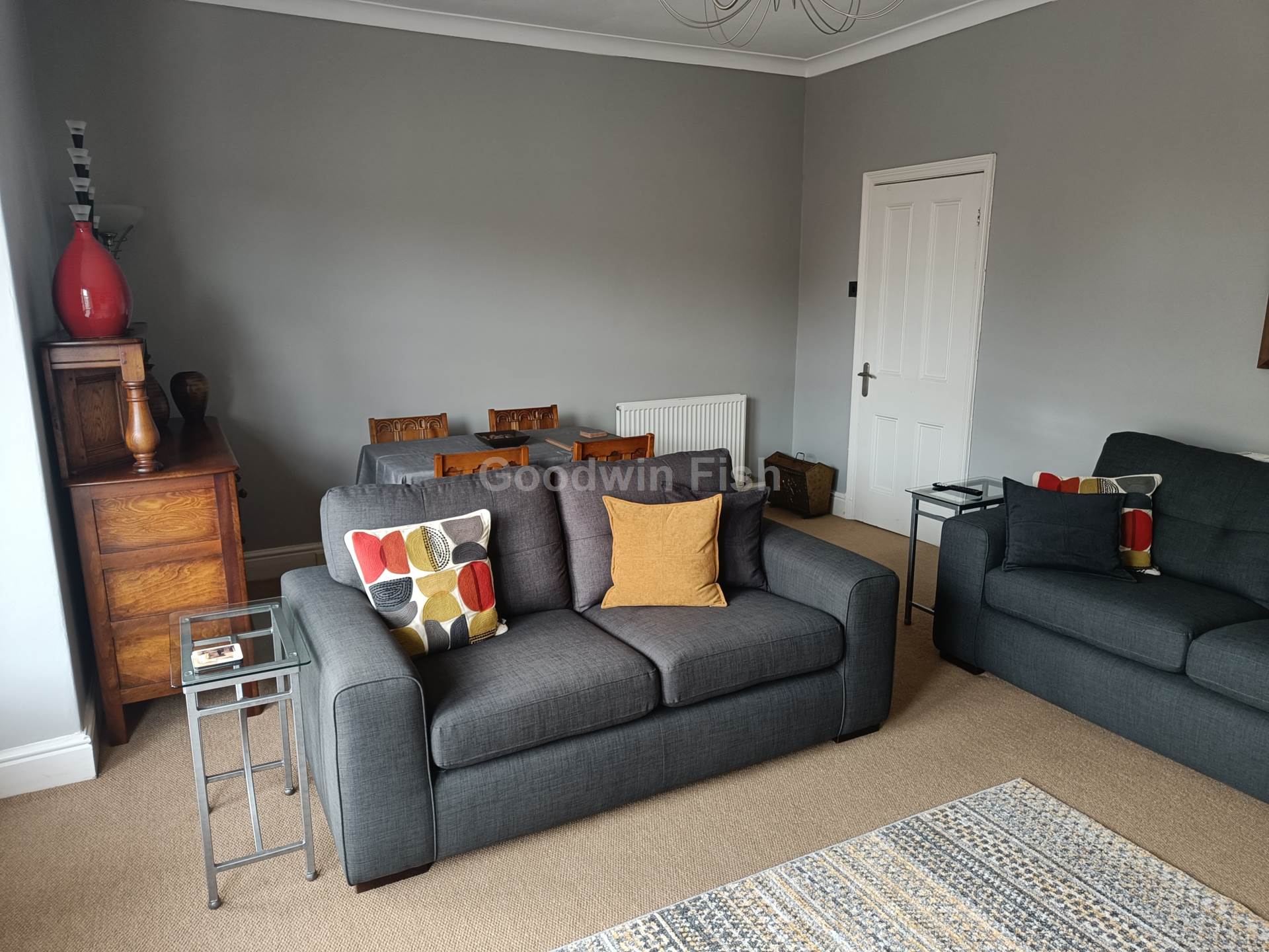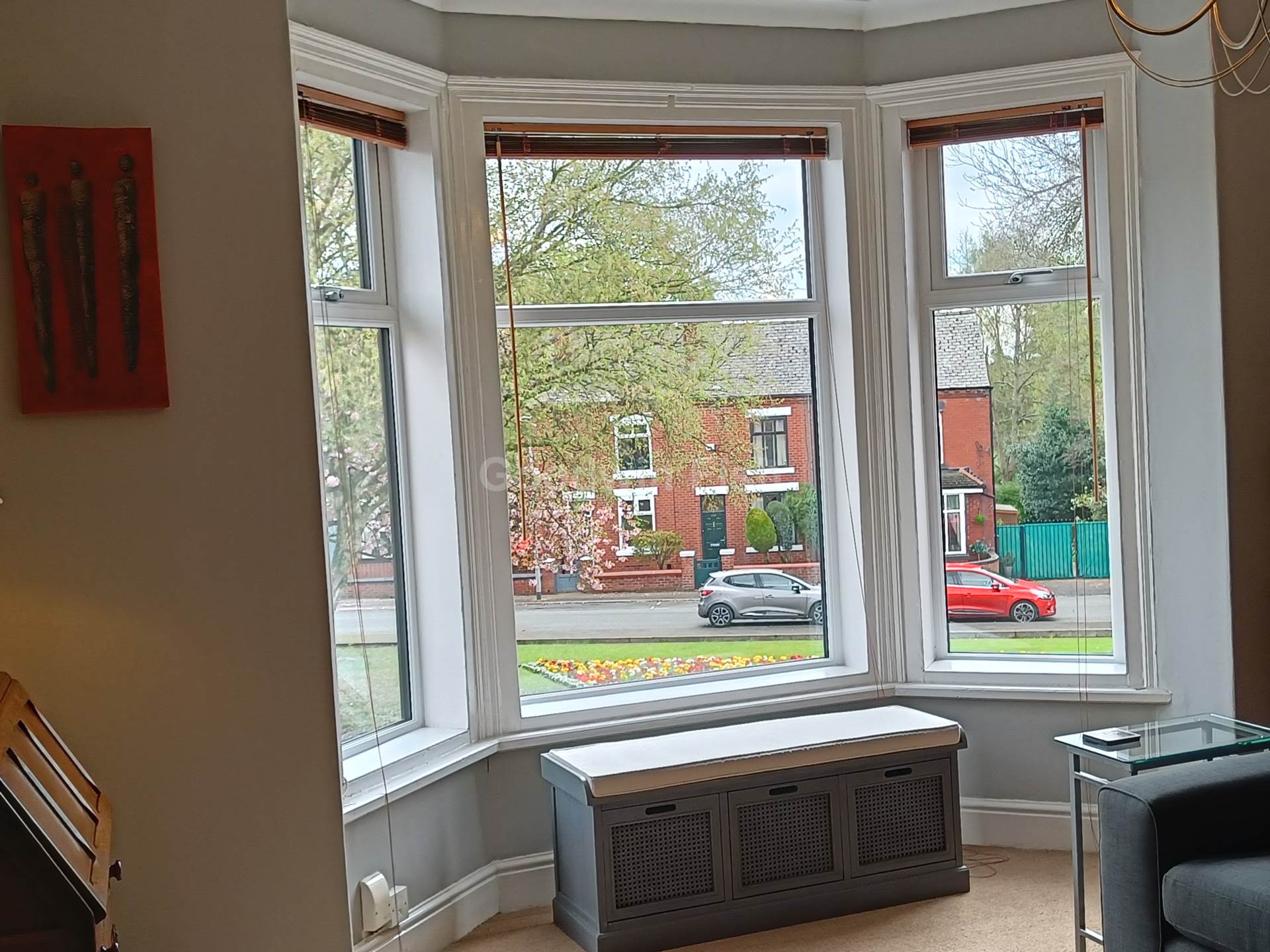 The view from the bay window overlooks a lawned garden area with mature trees on the opposite side of the road, ensuring that the living room is not overlooked in any way.