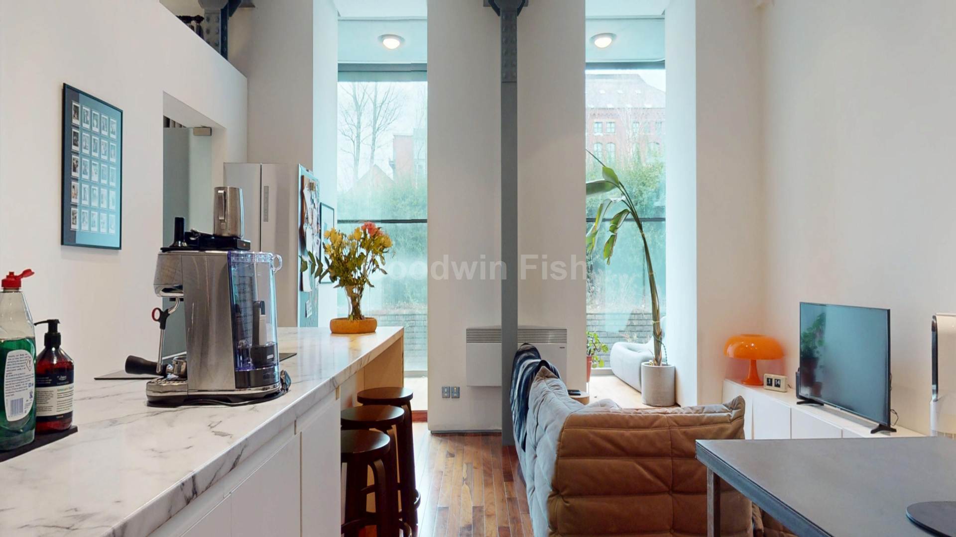 - High ceilings, steel girders and walnut flooring.